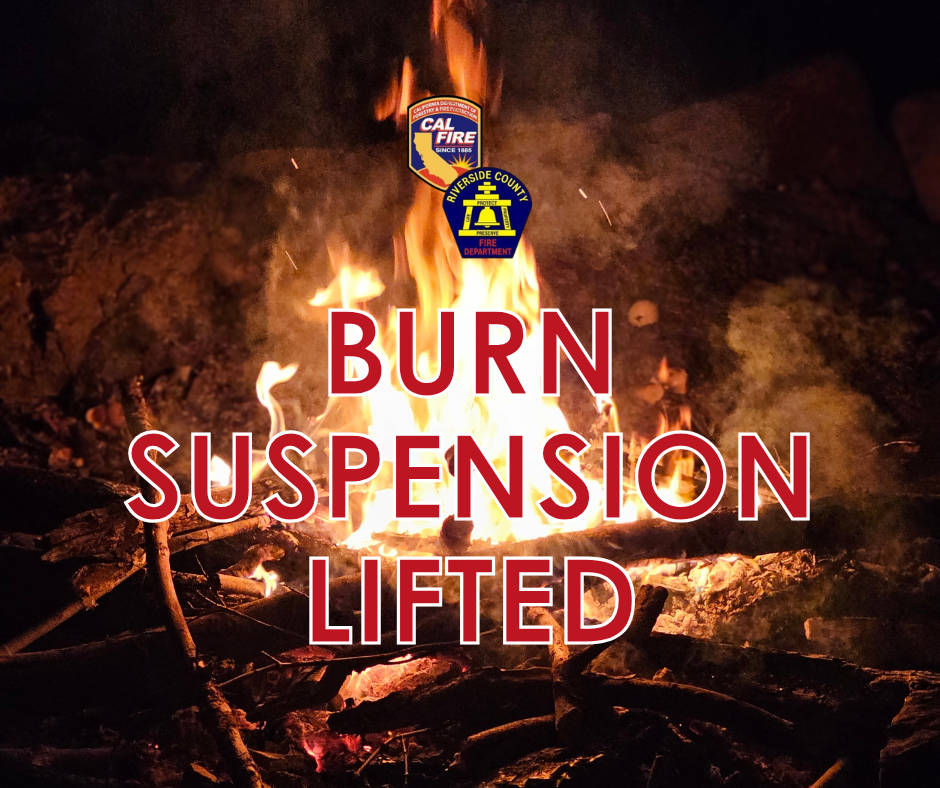 PERRIS, CA – CAL FIRE Riverside Unit Chief, Bill Weiser is formally canceling the burn permit suspension and advises that those possessing current and valid agriculture and residential burn permits can now resume burning on permissible burn days.